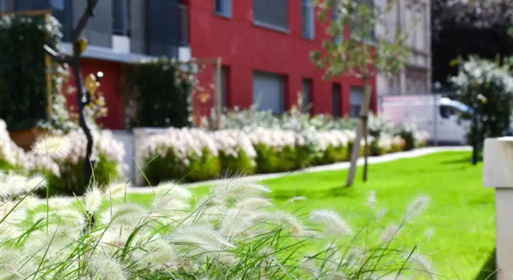 Les revêtements blancs lumineux et les arbres de type méditerranéen adaptés à nos climats (pins